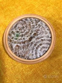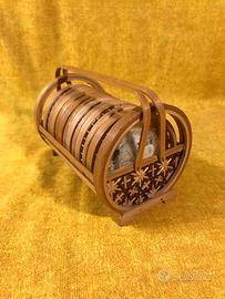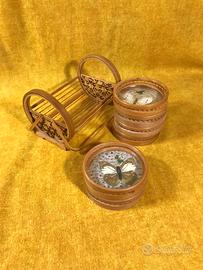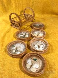 Set vintage di 6 sotto bicchieri realizzati con materiale composito: bambù, carta e vetro, realizzazione in decoupage di formelle con farfalle ricomposte con carta all’interno di due vetri. nel set, in uno dei piattini l’immagine della farfalla risulta scomposta. Il gruppo di sei piattini è contenuto al’ linterno di un caratteristico raccoglitore con manici realizzato in bambù misure generali cm.16x11x19. piattini diam. cm. 8,5.