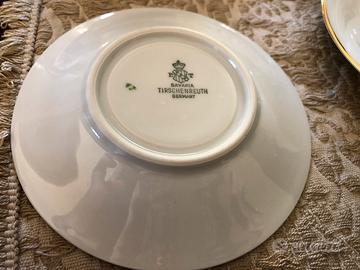 Set di 9 tazzine da caffè vintage da collezione P.T. Porzellanfabrik Tirschenreuth Bavaria in finissima porcellana dipinte a mano con motivi floreali e bordi in oro. Particolarissima e rara impugnatura a ricciolo.