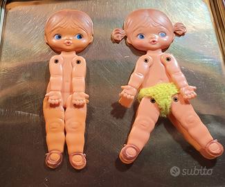 Set di 2 bambole SEBINO METTI, si tratta di due bamboline della SERIE famosa di bamboline pieghevoli da poter portare IN TASCA, uscita nel 1972. Nello specifico, dei famosi 3 figli della nota bambola più grande, qui si tratta di due dei figli: una bambina e una seconda bambina che però non ha più i codini e quindi somiglia al maschietto, infatti esiste un terzo fratellino che però qui non c'è.