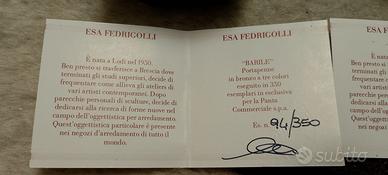set Esa Fedrigolli, Barili, SpiraleArte, prodotti per la Panta Commerciale Spa, numerati, bronzo, porta penne 8x5cm, fermacarte 4,5x4cm, confezione originale