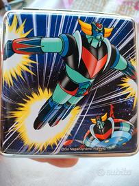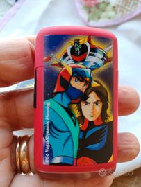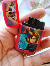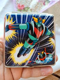 set composto da: accendino antivento ricaricabile ( tipo zippo) + portasigarette ( fino a 20 sigarette); chiusura a molla; elastici per tenere ferme le sigarette. Il tutto a tema Goldrake - ufo robot. Nuovo,mai utilizzato.