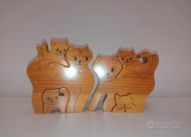 Set gatti in legno Bartolucci, famiglia di gatti fatta e dipinta a mano. 2 gatti grandi + 4 piccoli che si incastrano insieme