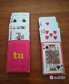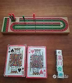 Vendo set di gioco, composto da tre mazzi di carte francesi (uno ancora sigillato, gli altri due aperti ma mai usati), cinque dadi da poker e segnapunti cribbage richiudibile, un tabellone da roulette, misure 40cm x 25cm, gettoni fishes colorati. Vendo anche gioco dello Shangai, composto da 41 bastoncini colorati. Tutto in ottime condizioni.