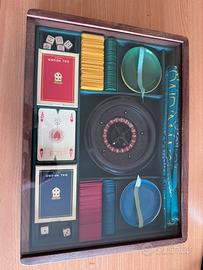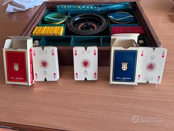 Elegante e raro cofanetto multigioco firmato DAL NEGRO, marchio d’eccellenza di Treviso. Il set è un pezzo vintage di alta qualità in condizioni estetiche eccellenti, perfetto per collezionisti o amanti del gioco classico. Il set include: Roulette professionale in bachelite/metallo, panno verde ricamato (Passe/Pair/Manque/Impair), mazzi di carte Dal Negro (Poker Super Plastic), set completo di fiches colorate e dadi originali. Il cofanetto è in legno pregiato con coperchio a scorrimento in vetro/plexiglass. Un oggetto d'arredo oltre che di gioco. Spedizione con imballaggio accuratissimo.