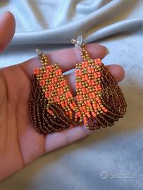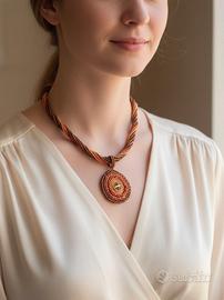 Questa parure artigianale, che evoca il lusso e le geometrie strutturate dello Stile Anni '50, è interamente realizzata con la tecnica di tessitura di perline (Bead Weaving technique). La collana, della lunghezza di 42 cm, è caratterizzata da una lavorazione tubolare a spirale nei colori intensi Oro, Arancione e Marrone metallico/Bronzo, culminando in un grande medaglione centrale a motivo concentrico, rifinito con un brillante cristallo sfaccettato. Gli orecchini abbinati sono a pendente con forma a ventaglio/goccia, e sono dotati di un gancio a perno Antiallergico.