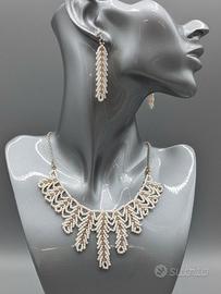 Elegante e raffinato, questo set di gioielli in stile Art Déco cattura l'essenza dell'epoca vintage attraverso una meticolosa lavorazione artigianale. La collana e gli orecchini sono realizzati interamente a mano intrecciando delicate rocailles di vetro color avorio e lucenti cristalli boemi che riflettono la luce con discrezione. La collana, sorretta da una resistente catena in acciaio inox lunga 43 cm, si adagia sul décolleté con grazia, mentre gli orecchini coordinati offrono il massimo comfort grazie al gancio a perno con farfallina in acciaio chirurgico antiallergico. Un insieme prezioso e senza tempo, perfetto per chi cerca un accessorio distintivo che unisca il fascino del passato alla sicurezza dei materiali moderni.