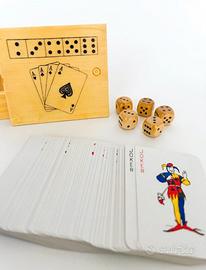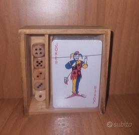 Set da gioco poker compatto in legno naturale con logo "Bingo VIP". La scatola presenta decorazioni incise a tema carte poker e domino. Perfetta come oggetto da collezione, regalo vintage o set da viaggio. Condizioni: Nuovo (come da foto) Dimensioni: circa 10x9 cm