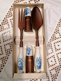 Set per insalata vintage anni 60/70 della Hostess Server Set in confezione originale composto da: un forchettone, un cucchiaio, porta sale e porta pepe. Tutti in legno scuro e ceramica bianca con raffigurato un mulino a vento in tinta blu.