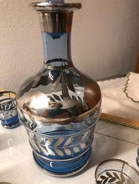 set da liquore con decanter decorato con motivi in argento e 6 bicchierini in vetro decorato in argento completo di vassoio tutto perfettamente conservato. Epoca anni 50.