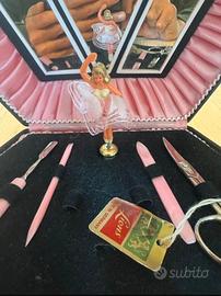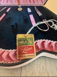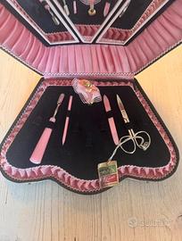Splendido set manicure vintage originale “The Lions”, completo di custodia rigida sagomata con interno in raso rosa e specchio triplo. Elemento distintivo e raro: presenza di ballerina con carillon perfettamente funzionante con movimento Swiss Musical Movement. All’apertura, la ballerina si anima accompagnata dalla melodia, trasformando l’oggetto in un vero pezzo da collezione. ⸻ Caratteristiche principali: • Marca: The Lions • Produzione: Made in Germany • Movimento musicale: Swiss Musical Movement • Carillon: perfettamente funzionante • Specchio triplo interno • Interno originale in raso rosa plissettato • Custodia rigida sagomata ⸻ Misure e peso: • Lunghezza: 28 cm • Larghezza: 19 cm • Spessore: 6 cm • Peso: 530 grammi ⸻ Contenuto: Set manicure con strumenti originali (forbicine, lime e accessori con manici rosa coordinati). Alcuni alloggiamenti vuoti (come da foto). ⸻ Estetica e valore: Perfetto esempio di design anni ’50: • stile boudoir / vanity set • palette rosa e nero iconica • oggetto decorativo oltre che funzionale Non è un semplice kit, ma un elemento da esposizione. ⸻ Condizioni: Buone condizioni vintage. Segni del tempo su custodia e interno (visibili in foto). Etichetta originale presente. Carillon testato e funzionante. #vintage #manicurevintage #vanityset #anni50 #collezionismo #beautyset #carillon #swissmovement #retrostile