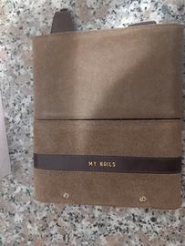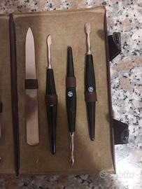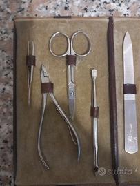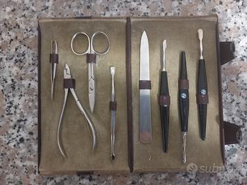 Set manicure vintage per la cura delle mani e dei piedi con n. 8 strumenti in acciaio in una custodia scamosciata con chiusura con bottone a pressione. misure c. 17 x 18 (chiuso)