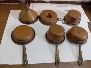 Set miniatura di utensili da cucina in rame Vintage anni 60 Totale 6 pezzi, padelle, tegame,pentola , casseruola e imbuto Ottimo per collezionisti o anche x decorare qualsiasi ambiente appendendoli alle pareti . Ritiro zona Vomero Si effettua spedizione