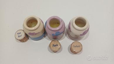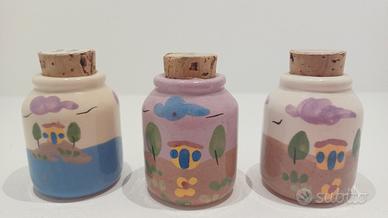 set di 3 piccoli vasi in ceramica decorati a mano, contenenti creme profumate perfettamente conservate. anni 80.