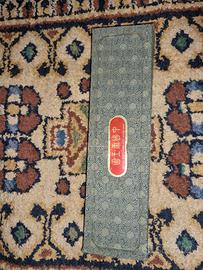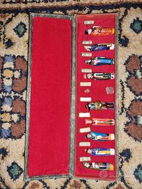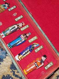 cofanetto vintage contenente miniature dipinte a mano raffiguranti storici imperatori e re cinesi. Le statuine sono alloggiate nella loro scatola originale a forma di astuccio, rivestita esternamente in tessuto lavorato e internamente in velluto rosso. Ogni figura è accompagnata da una piccola etichetta con il nome in caratteri cinesi. Manca una statuina (la quinta partendo dall'alto, di cui rimane solo la traccia dell'incollatura). Le restanti 9 miniature presenti sono in buono stato conservativo. Articolo indicato per amanti dell'oggettistica orientale, appassionati di cultura asiatica o come piccolo complemento d'arredo etnico. miniature cinesi, statuine imperatori cinesi, oggettistica orientale, vintage cinese, souvenir cina, china emperors and kings, arredamento etnico, cofanetto cinese.