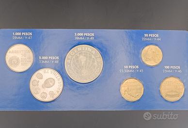 set di monete commemorative dei Mondiali di Calcio Argentina '78 (FIFA World Cup), emesso dalla Zecca Argentina. Questo set è in condizioni Fior di Conio (FDC) e viene offerto nella sua confezione originale stilizzata dell'epoca,