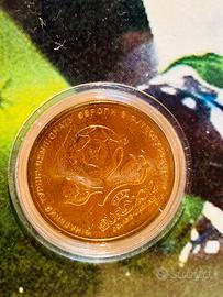 Moneta in ottone, con simboli nazionali e riferimenti all’Europeo.