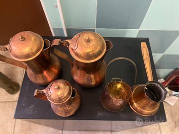 Vendo set di 4 pezzi in rame battuto a mano + caffettiera turca : 3 bricco uno di dimensione piu piccola , 1 secchiello e 1 caffettiera per caffe turco,.