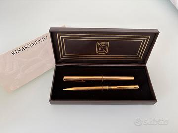 Set completo: stilografica (fountain pen) + penna a sfera (ballpoint). La scatola è originale OMAS Rinascimento (marrone scuro con bordi oro e logo "R" stilizzato sul coperchio). finitura lucida. Scambio a mano