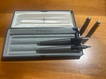 Si tratta di un set di penne Parker 75 Ciselé in argento sterling, composto da una penna stilografica e una penna a sfera, presentate nella loro scatola originale.