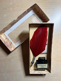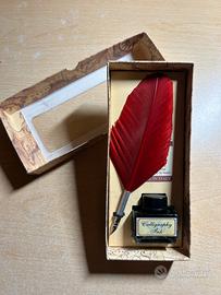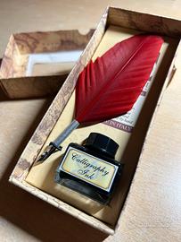 Vendo set di scrittura con penna a piuma rossa causa inutilizzo, nuovo con tutti i pezzi originali. Perfetto per amanti della calligrafia o come regalo elegante. Il set include: