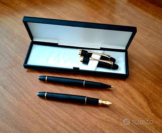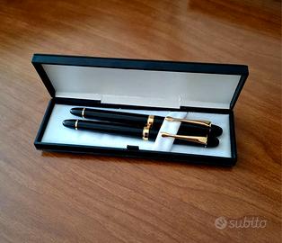 Il set è composto da una penna stilografica e una biro, entrambe nere con dettagli dorati molto eleganti. Vengono nella loro scatolina originale con interno bianco.