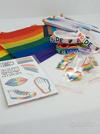 Il perfetto SET per un PRIDE LGBT, per DIECI! 10 bandiere 10 bracciali 10 tattoo 5 Spille