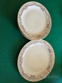 Set Piatti Krautheim & Adelberg Selb Bavaria - Porcellana di Lusso Fine anni '40 Splendido set di piatti in finissima porcellana tedesca della celebre manifattura Krautheim & Adelberg (K&A Selb). Krautheim è nota per aver prodotto alcune delle porcellane più trasparenti e raffinate della Baviera, spesso fornitrice di corti e grandi hotel. Pregiato bordo lavorato a rilievo con texture "a nido d'ape/pizzo". Ghirlanda di fiori bianchi intrecciata con nastri color lavanda/grigio. Profilo rifinito a mano in oro zecchino. Condizioni: Eccellenti. La porcellana è integra, senza sbeccature o crepe. L'oro sul bordo è in ottimo stato di conservazione. Un pezzo di vera classe per una tavola importante o per collezionisti del marchio K&A.