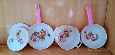 Set di stoviglie giocattolo per bambini anni 80, caratterizzato da illustrazioni del personaggio "Fragolina Dolcecuore" (Strawberry Shortcake).
