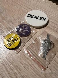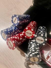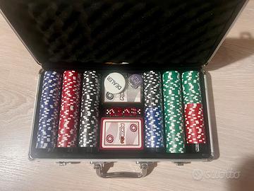 Valigetta professionale da poker in alluminio, con interno in spugna protettiva. Set completo e in condizioni eccellenti. • 8 stack di fiches ancora sigillati • 4 stack aperti ma completi Totale circa 300 fiches in quattro colori. Incluso: • 2 mazzi di catte Modiano PokerClub (mai usate) • Bottone Dealer • Bottoni Big Blind e Little Blind sigillati • 5 dadi rossi • 2 chiavi della valigetta La valigetta presenta qualche segno esterno. L’interno è perfetto e il set è stato usato pochissimo.