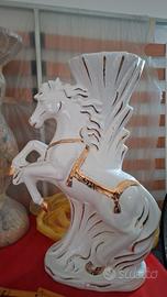 Centrotavola e Vaso Cavallo in Porcellana Capodimonte. Splendido set d'arredo vintage in pregiata porcellana di Capodimonte, caratterizzato dal classico colore bianco lucido con eleganti rifiniture in oro zecchino. Il set è composto da tre pezzi coordinati con lavorazione a rilievo (motivo a foglia/piuma): Vaso Scultoreo con Cavallo Rampante: pezzo di grande impatto visivo, finemente rifinito nei dettagli della criniera e dei finimenti dorati. Elegante Alzata/Base: lavorata in coordinato per sostenere il vaso o essere usata separatamente. Ampia Ciotola Centrotavola: con bordi ondulati e dettagli in oro, perfetta per completare l'arredo di un salotto classico o prestigioso. Dettagli: Marchio: Capodimonte (presente marchio "N" coronata blu/oro sotto la base - vedi foto). Produzione: Made in Italy. Condizioni: Eccellenti, i pezzi sono stati conservati con cura, non presentano sbeccature o crepe evidenti. Stile: Barocco / Classico Veneziano anni '60/'70. Un'ottima occasione per collezionisti o per chi desidera un pezzo di antiquariato italiano di alta qualità per la propria casa. Base altezza 16 cm lunghezza 45 cm. Centrotavola vaso con Cavallo Rampante altezza 68 cm. Fruttiera/coppa altezza 20 cm lunghezza 43 cm.