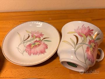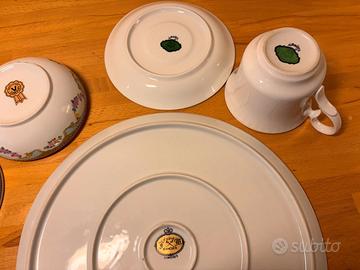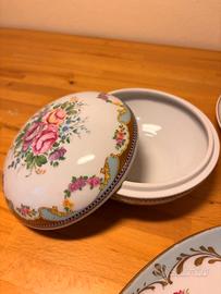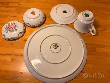 Elegante set composto da 4 pezzi originali in porcellana Limoges, tutti con marchio autentico sotto la base. Decorazioni floreali dipinte e dettagli in oro zecchino, tipici della tradizione francese di Limoges. Il lotto comprende: • Grande piatto Limoges con decorazione centrale a bouquet e ricchi motivi dorati (marchio J. Pouyat Limoges) • Scatolina portagioie Limoges con coperchio decorato a rose e bordo oro • Tazzina Limoges con decori floreali e bordo oro • Piattino Limoges abbinato alla tazzina, floreale con bordo oro Pezzi raffinati e da collezione, perfetti come complemento d’arredo, regalo elegante o per chi ama la vera porcellana francese. Vendita in lotto unico. 📦 Spedizione disponibile