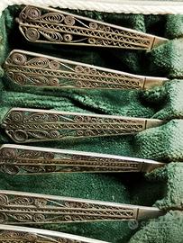 La confezione contiene 6 cucchiaini di piccole dimensioni probabilmente da tè o da dessert con intricate lavorazioni in filigrana sui manici con un design elaborato e traforato.