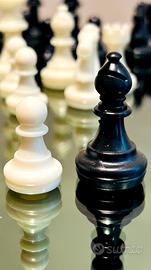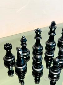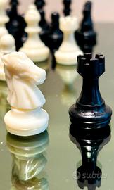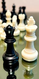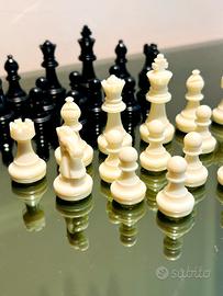 Elegante set di scacchi completo, composto da 32 pezzi in plastica lucida, perfetti per amatori, principianti o come oggetto decorativo.