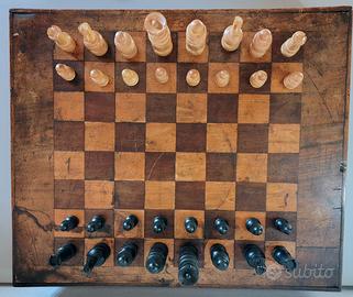 Scatola da gioco. Set scacchi in legno tornito Regence. Pedine dama in legno. Contatori vari backgammon e bicchieri in pelle e cuoio per dadi. Misure 33x39x8,5.
