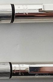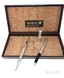 Set completo da scrittura Senator – Auguri di Mondadori Made in Germany, edizione speciale regalo aziendale anni ’80. Linee eleganti con fusto in metallo satinato e incisione a righe parallele tipica Senator. Composto da: