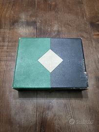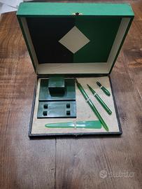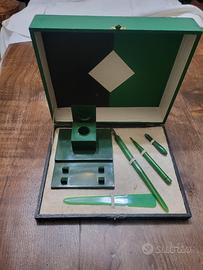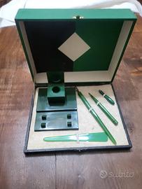 Splendido set da scrivania d'epoca, risalente agli anni '30 o '40, realizzato in un elegante materiale plastico del periodo (probabile bachelite o resina fenolica) in color verde bosco marmorizzato. Il set è conservato nella sua scatola originale (misure 20x25 cm), caratterizzata da un raffinato design geometrico bicolore all'interno del coperchio, tipico del gusto Art Déco dell'epoca. Il set comprende: Base calamaio quadrata: con contenitore per inchiostro e coperchio a cerniera. Pennino da intingimento: cannuccia con punta metallica originale. Tagliacarte: in resina traslucida verde smeraldo. Matita meccanica / Portamine: coordinata nel design. Manico accessorio: (Nota: questo pezzo è incompleto, manca la base/matrice originale del timbro, come mostrato in foto di dettaglio). Condizioni: Il set è in ottime condizioni estetiche generali, con colori vividi e senza crepe strutturali sugli altri pezzi. Segni del tempo coerenti con l'età che ne testimoniano l'autenticità. Un pezzo di modernariato perfetto per collezionisti o per dare un tocco di classe a uno studio professionale.