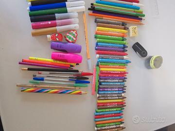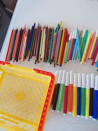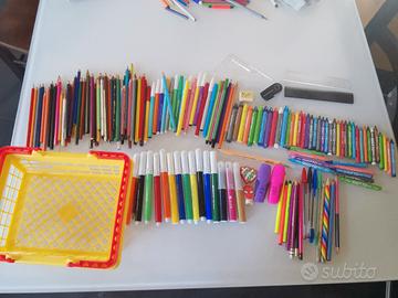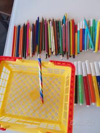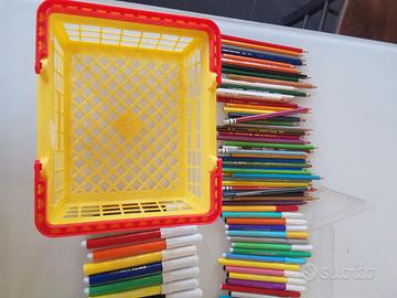 Set scuola compreso di pastelli a cera nuovi, pastelloni a cera nuovi, cestino matite, pennarelli, evidenziatori e penne che scrivono perfetti.