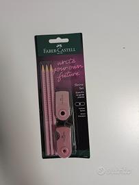 1 confezione di matite gomma e temperamatite. Marca: Faber Castell. La confezione contiene 3 matite punta 2 = B di colore rosa. 1 temperamatite ad un foro standard con serbatoio, di colore rosa. E una gomma di alta qualità di colore rosa. A soli 3€ anziché 8€