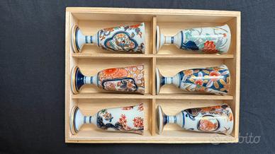 Squisito set di sei tazze contemporanee in porcellana giapponese Ko-Imari (antica Imari) a gambo corto con splendidi motivi floreali, nei vivaci colori rosso, blu e verde e con dettagli dorati, caratteristiche della porcellana Ko-Imari chiamata kinrande.
