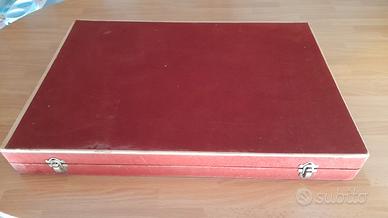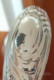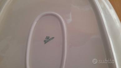 Set da portata per pesce composto da vassoio ovale in porcellana Bavaria bianca di alta qualità con un decoro centrale raffigurante un pesce e un bordo rifinito oro. Coppia di posate da servizio: forchettone e coltello con lame finemente incise e manici lavorati in stile barocco, riportano il marchio "800" ma sono da considerarsi argentate (placcate). Presentano i segni del tempo e il forchettone ha una macchia dove è saltato lo strato. Con custodia originale in velluto rosso con segni del tempo esterni dovuti dagli anni ma è integra e solida.
