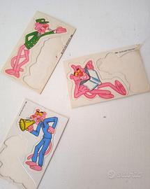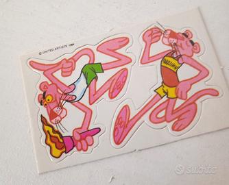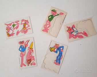 Set composto da sette adesivi/figurine raffiguranti la Pantera Rosa, appartenenti alla serie Sorprese Formaggino Mio - anno 1984.