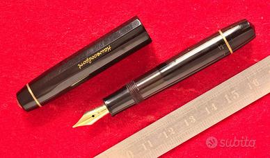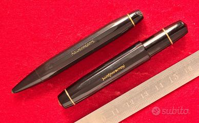 --Stilografica revisionata e garantita Pennino in oro 14k, misura F Materiale: resina nera, colore nera con finiture dorate Lunghezza (chiusa/aperta/calzata): 8.9/8.5/11.5 cm Diametri (sezione/fusto): 9/11 mm Pesi (totale/solo cappuccio): 11 /3 gr Riempimento: caricamento a pistone Condizioni: ottime, nuova guarnizione del pistone Note: revisionata non lucidata Portamine, estrazione a rotazione Lunghezza: 9.1 cm Diametro fusto: 10.5 mm Peso: 10 gr Diametro mina: 1.1 mm Condizioni: ottime Astuccio Lunghezza, larghezza, altezza, peso: 9.7 cm / 3.1 cm / 1.3 cm / 8 gr Materiale: similpelle verde Condizioni: buone, con medaglietta Kaweco originale, non lucidata Ulteriori foto disponibili a richiesta rif: 437
