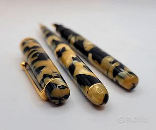 In vendita questo bel set composto da penna stilografica e biro Columbus Academia, fuori produzione da tempo realizzate per l’azienda italiana Columbus nella prima metà degli anni ‘90, probabilmente dalla giapponese Platinum. Il nome del produttore giapponese Mr. Yamazaki potrebbe essere un nome di fantasia, una sorta di trovata pubblicitaria per giustificare la provenienza di queste penne dal paese del sol levante. La celluloide, ed è celluloide, è davvero fantastica maculata avorio/nero con la finestrella per il livello dell'inchiostro grigia trasparente. La stilografica non è mai stata inchiostrata, perfetta, mai usata. Ha il pennino in acciaio dorato dal tratto fine tipico giapponese, la biro monta un refil Parker