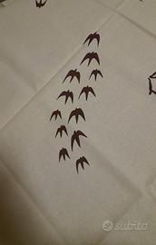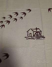 Tovaglia rettangolare 140x124 con 4 tovaglioli coordinati 35x35 originale Mulino Bianco, risalente alla celebre collezione promozionale del 1985 per collezionisti. Il set presenta l'iconica grafica stilizzata del mulino e lo stormo di rondini in marrone scuro su fondo panna, 100 % cotone di buona qualità made in Italy. Nuova mai usata eccellente stato di conservazione, senza macchie o aloni.