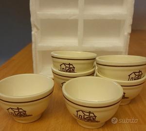 6 tazzine/ciotoline piccole ideali per caffè, salse o piccoli dessert, mai usate ancora nel polistirolo originale. Dimensioni diametro sopra 8,5 cm sotto 4,5 cm e altezza 6 cm.
