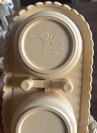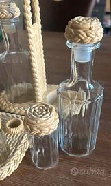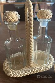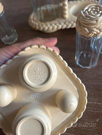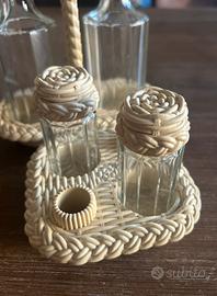 Set porta sale, pepe e stuzzicadenti e porta aceto e olio in vetro e plastica made in italy. Vintage anni’60 di Desco Al Ma Rose design by A. Salviato. Vetro tasparente e plastica colore beige chiaro. Usato ma in ottome condizioni. Modernariato Anni’60