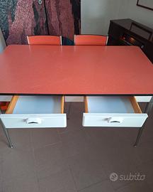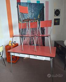 C'è qualcosa di magico nel design italiano degli anni '60 e questo set da pranzo firmato Salvarani ne è la prova perfetta. Non è solo un tavolo, ma un pezzo di storia che unisce l'estetica vibrante dell'epoca a una funzionalità geniale, come i cassetti integrati sotto il piano color corallo. Sfoglia la gallery per scoprire ogni dettaglio: dal contrasto tra il laminato e i profili neri alla linea snella delle sedie coordinate in metallo cromato e bianco. È un set nato per durare, capace di dare un carattere unico a un ambiente moderno o vintage. Un pezzo raro, in condizioni discrete, che aspetta solo la sua prossima casa! Dimensioni: tavolo: lunghezza cm 140,larghezza cm 80, altezza cm 76 sedie: altezza seduta cm 46, ingombro seduta cm 36x38,5, altezza sedia cm 85 Trasporto da concordare