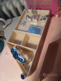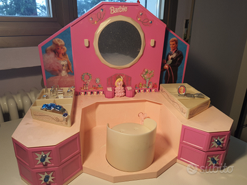 Barbie (anni '90). Set da toeletta richiudibile e con carillon (girano sia la mini-Barbie sul ripiano che la poltrona, grazie alla carica posta sulla destra -l'elastico però è rotto e andrebbe cambiato per permettere il funzionamento-); completo di: 4 cassetti apribili più altri scomparti aperti e chiusi; profumi, ninnoli, portafoto e oggettistica originale della bambola, gioielli di Barbie (bracciale e anello -a cui manca un piccolo pezzo-).