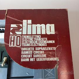 Set vintage Lima in scala HO (1:87) modello "Circuito Sopraelevato". La confezione include un locomotore diesel SNCF 67001 blu, una locomotiva elettrica rossa, una carrozza passeggeri "Le Mistral" d'argento e una carrozza ristorante blu "Wagons-Lits". Completo di binari (curvi e dritti) e componenti per la sezione sopraelevata.