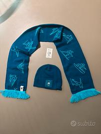 • Sciarpa jacquard: Colore blu ottanio con scritte bianche e icone degli sport invernali sul retro. Frange azzurre a contrasto.